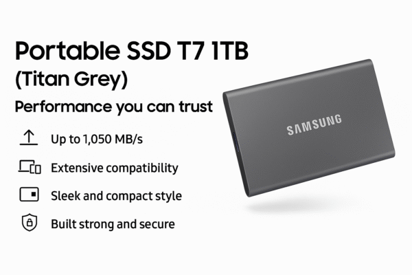 The Samsung Portable SSD T7 1TB (Titan Grey) delivers sequential read/write speeds of up to 1,050/1,000 MB/s with a USB 3.2 Gen 2 interface. Whether you’re transferring large 4K videos, editing directly from the drive, or managing heavy gaming files, the T7 gives you speed and efficiency on the go.